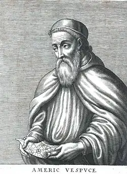 | Trecho da carta de Vespúcio sobre o Novo Mundo em Documento do Brasil Colonial; Américo Vespúcio (9 de março de 1454 – 22 de fevereiro de 1512) foi um mercador e explorador de oceanos italiano. | ||