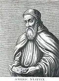 | Trecho da carta de Vespúcio sobre o Novo Mundo em Documento do Brasil Colonial; Américo Vespúcio (9 de março de 1454 – 22 de fevereiro de 1512) foi um mercador e explorador de oceanos italiano. | ||