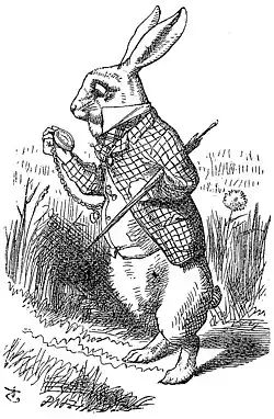 - Não havia nada de tão extraordinário nisso; nem Alice achou assim tão esquisito ouvir o Coelho dizer consigo mesmo: "Ai, ai! Ai, ai! Vou chegar atrasado demais!" [...]; mas quando viu o Coelho tirar um relógio do bolso do colete e olhar as horas, e depois sair em disparada, Alice se levantou num pulo.