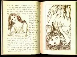 - Alice estava começando a ficar muito cansada de estar sentada ao lado de sua irmã na ribanceira, e de não ter nada que fazer; espiara uma ou duas vezes o livro que estava lendo, mas não tinha figuras nem diálogos, "e de que serve um livro", pensou Alice, "sem figuras nem diálogos?"