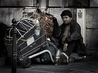 Pessoa pobre: sem teto que vive perambulando pelas ruas de Paris