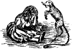 Então ela o chamou de forma delicada: “Querido camundongo! Volte e não vamos mais falar de gatos e cachorros já que você não gosta deles!” Quando o camundongo ouviu isso, virou e nadou devagar até ela: seu rosto estava pálido (de emoção, ela pensou), com uma voz baixa e tremida “Vamos para a costa e então vou lhe contar a minha história. Assim você vai entender o motivo de eu odiar gatos e cachorros.”