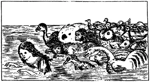 Já era hora de ir, pois a piscina já estava ficando cheia de pássaros e animais que haviam caído nela. Tinha um Pato e um Dodo, uma Arara e uma Águia e várias outras criaturas curiosas. Alice liderou, e todo mundo nadou para a costa.