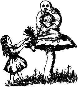 Ela ficou na ponta dos pés e olhou na borda do cogumelo. Seus olhos imediatamente viram aqueles de uma grande lagarta azul que estava sentada com seus braços cruzados, quietamente fumando um longo narguilé e falando como se não percebesse nem ela ou ninguém.