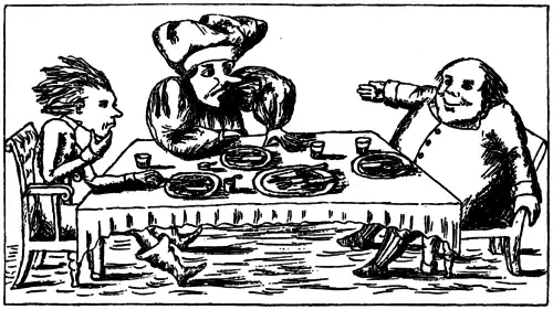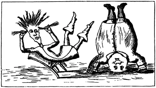 Alice ficou por um minuto olhando, pensativa, para o cogumelo para então pegar um pedaço e cuidadosamente quebrá-lo em dois, segurando o caule em uma mão e o topo na outra. “O que o caule faz?”, ela disse e deu uma mordiscada para tentar; no próximo momento ela sentiu um golpe violento em seu queixo: havia batido em seu pé!