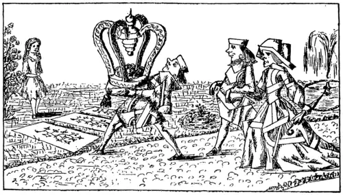 “Quem são eles?” Perguntou a Rainha, apontando aos três jardineiros deitados ao redor da roseira, pois, já que eles estavam de rosto no chão e os padrões de suas costas eram os mesmos dos demais, ela não sabia dizer se eles eram jardineiros, soldados, cortesãos, ou seus filhos.