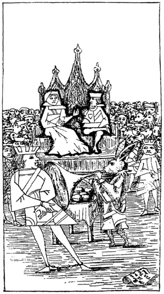 O Rei e a Rainha estavam sentados em seus tronos quando eles chegaram, com um grande grupo ao redor: o Valete estava em custódia e ao lado do Rei estava o Coelho Branco, com um trompete numa mão e um rolo de pergaminho na outra.