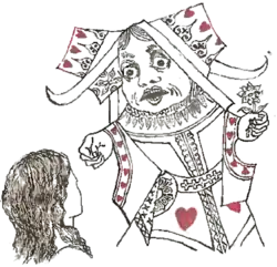 “Como quiser sua Majestade, meu nome é Alice.” Ela disse com coragem, pois pensou consigo mesma: “Porque? Eles são apenas cartas! Não preciso ter medo deles!”