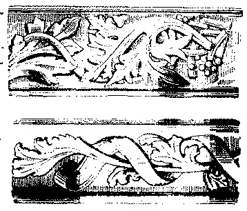 Os crochets, em parte differentes dos executados no seculo XIV, mostram em geral mudança de fórma análoga a dos ornamentos, representam folhas de couve ou cardo encrespadas, arredondadas, reviradas, parecendo-se com cabeças de golphinhos.