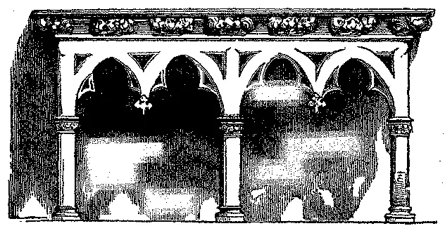 No final do seculo XV e no XVI empregava-se quasi constantemente, para os tumulos arqueados, arcos postos a par, similhante a este exemplo que damos: collocavam um certo numero de tumulos d'este genero ao correr das paredes nas grandes igrejas.
