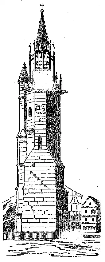 No seculo XV, em logar de flanquear com duas torres as fachadas das grandes igrejas, tinham muitas vezes levantado uma unica torre quadrada ao meio do frontão occidental, como S. Bavon de Gand, a cathedral de Berne, e a cathedral de Ulm, etc.