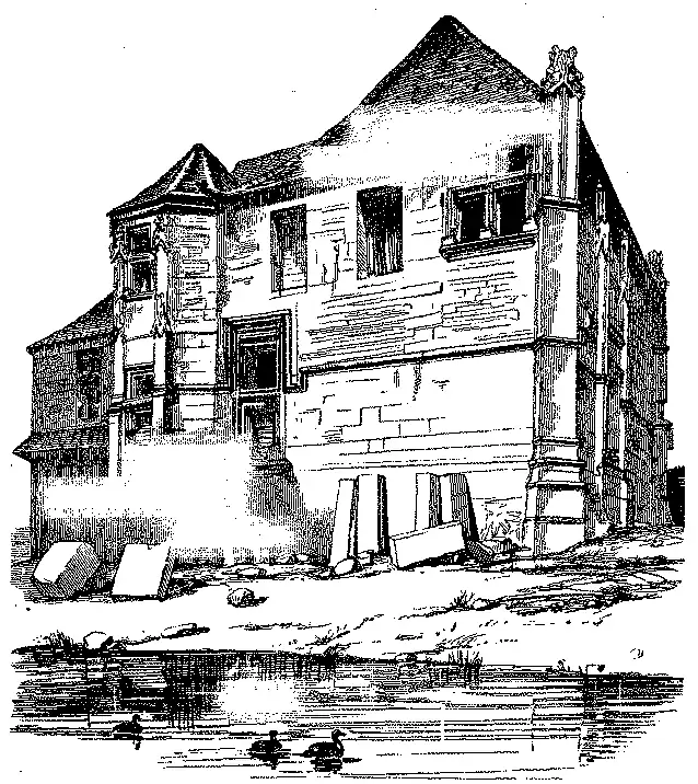 Damos, por exemplo, duas casas do fim do seculo XV, construidas de cantaria, primeiramente aquella que existe em S. Pedro-sur-Dive, pag. 264 [fig. 255], na margem do rio, e dependentes do mosteiro dos benedictinos: suppõe-se que serviam de tribunal de justiça d'aquella ordem. A torrinha octogona que guarnece os angulos encerra um oratorio muito elegante. As vigas apparentes do tecto das casas, principalmente as das grandes salas, eram ornadas com obras de talha no gosto da época.