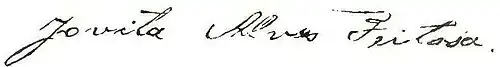 « Perguntado qual o seu nome, idade, estado, naturalidade, filiação, meios de vida e residencia. Responder chamar-se Antonia Alves Feitosa, conhecida desde menina pelo appellido de Jovita, com desesete annos de idade, solteira, natural dos Inhamuns, da provincia do Ceará, ser filha de Simeão Bispo de Oliveira e de Maria Rodrigues de Oliveira, viver de suas costuras, ser moradora no Brejo Secco, no Inhamuns, e somente de ha sete mezes para cá na villa de Jaicós, desta provincia.