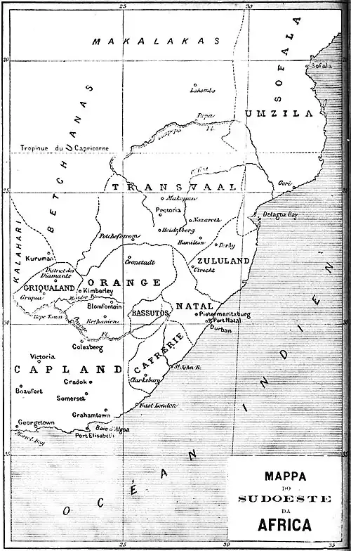 Depois de inteiramente colonisado pelos boers, antigos cidadãos hollandezes do Cabo, que em quinze ou vinte annos espalharam por elle uma população agricola de mais de cem mil brancos, o Transvaal excitou, como era natural, a cobiça da Gran-Bretanha. Foi por isso que ella o annexou em 1877 ás suas possessões do Cabo. Mas as frequentes revoltas dos boers, que se obstinam em querer ser independentes, tornam ainda muito duvidosa a sorte d'aquelle bello paiz.