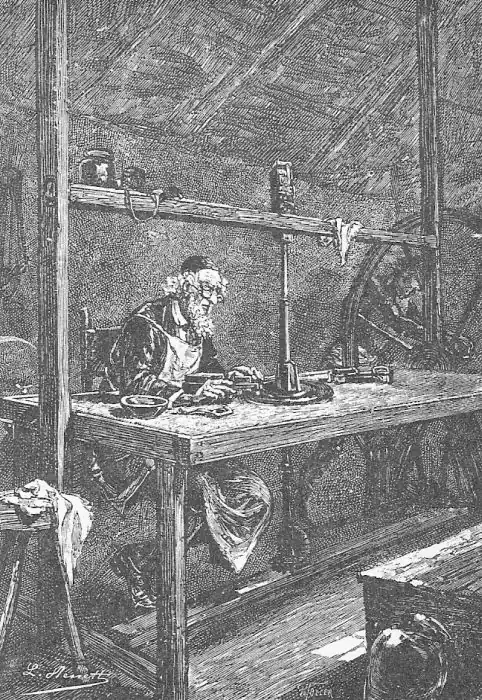 Dentro de uma escudella, posta sobre um banco collocado proximo da janella, achavam-se os diamantes brutos confiados a Jacobus Vandergaart, e cujo valor era por vezes consideravel. Quando elle queria clivar um diamante cuja crystallisação lhe não parecia perfeita, começava por verificar bem, com auxilio de uma lente, a direcção das superficeis de clivagem que dividem todos os crystaes em laminas de faces parallelas ; depois, com o fio de um diamante já clivado, fazia uma incisão na direcção desejada, introduzia n'ella uma pequena folha de aço e dava uma pancada secca.