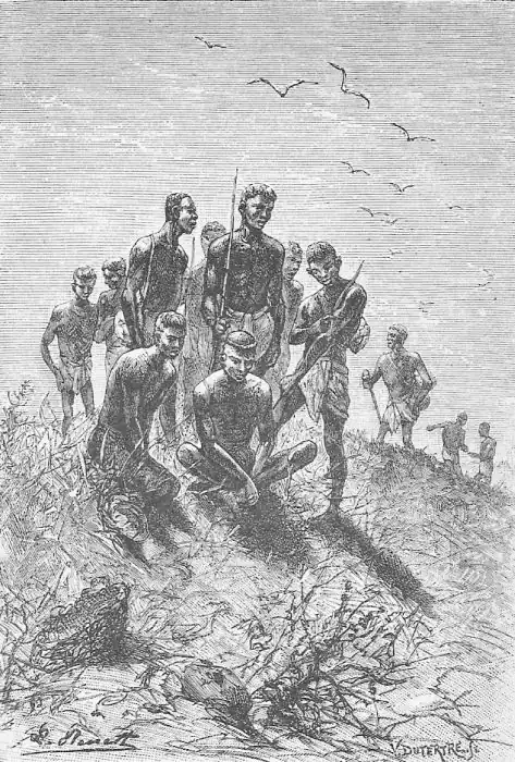 Aquella pobre gente vinha das longiquas montanhas que separam a Cafraria propriamente dita do paiz dos bazutos. Tinham andado mais de cento e cincoenta leguas a pé ao longo do rio Orange, caminhando a um de fundo, vivendo do que encontravam pelo caminho, isto é, de raizes, de fructos silvestres e de gafanhotos. Mettia medo a magreza d'elles ; pareciam mais esqueletos do que seres vivos. Com as pernas escanifradas, os compridos troncos nus, a pelle enrugada parecendo cobrir um arcabouço vasio, com as costellas salientes e as faces encovadas, tinham mais cara de quem quer devorar um bife de carne humana do que de quem vem dar dias de bom e productivo trabalho. Por isso ninguem se mostrava disposto a contratal-os, e elles para ali estavam acocorados á beira do caminho, indecisos, tristes, embrutecidos pela miseria.
