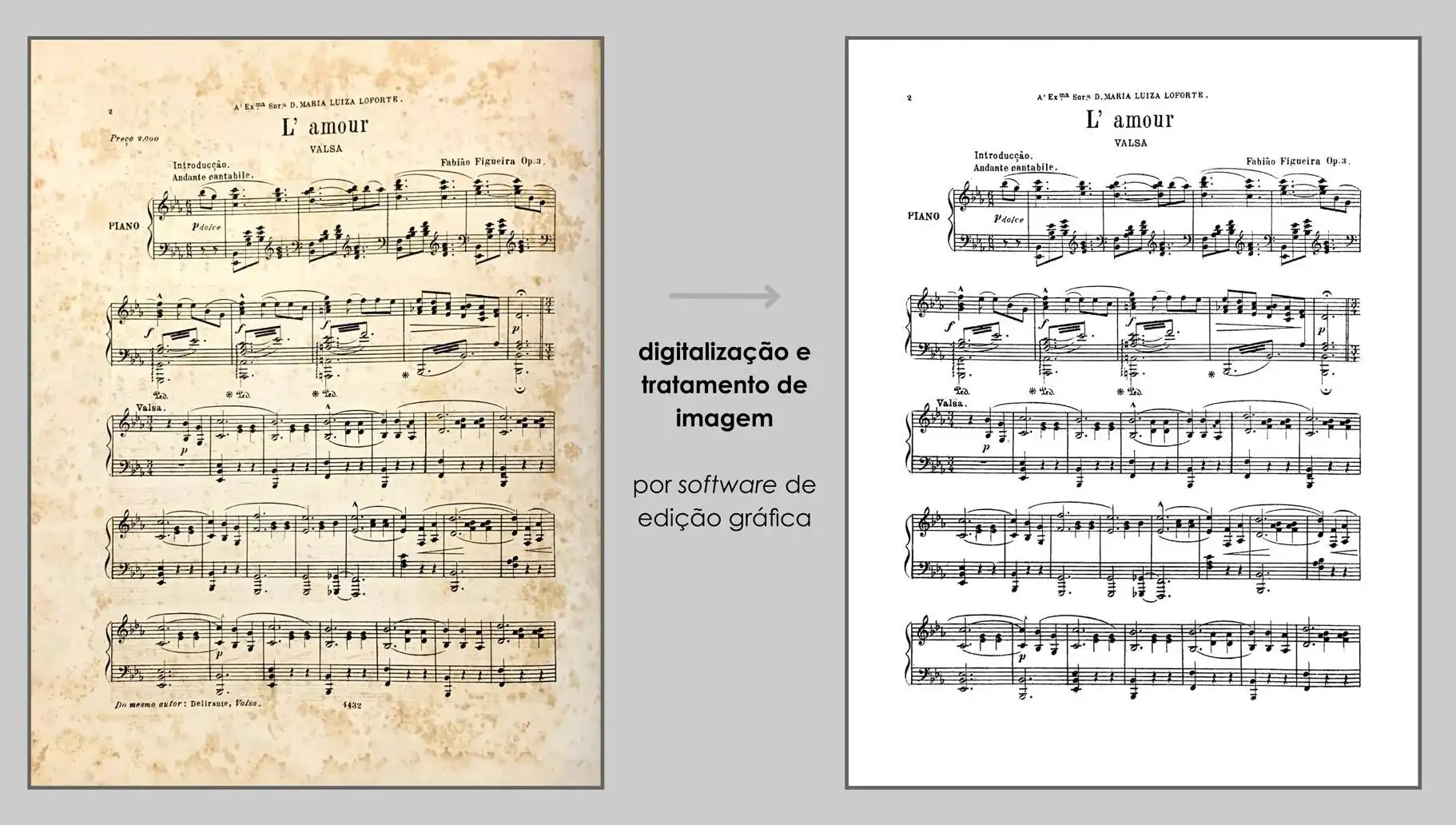 No Brasil, as normas de digitalização foram estabelecidas pelo Conselho Nacional de Arquivos (Conarq) (2021). O processo de digitalização é precedido pelo exame e preparação dos documentos, higienizados e restaurados quando necessário. Após a digitalização, as imagens são tratadas utilizando-se de um software específico para esse fim; o tratamento das imagens visa restituir aos documentos a aparência que tinham quando recém-impressos. Aspectos visuais como nitidez, contraste, nível de preto, nível de branco, curvas etc. são aprimorados em um primeiro momento; em um segundo, passa-se à correção da geometria (visual), ou seja, corrigir distorções decorrentes da digitalização, da encadernação ou do armazenamento do papel. Em seguida, passa-se à eliminação de rabiscos, manchas e respingos e à complementação de linhas e curvas musicais; por fim, exportam-se as páginas tratadas. As duas primeiras etapas podem ser agrupadas por conjuntos de ações pré-definidas, disparadas em cadeia para acelerar e uniformizar os resultados. Como última etapa, exporta-se todas as páginas do arquivo para o formato PDF, com resolução de 300 DPI[3].