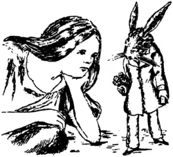 Alice estava começando a ficar bem cansada de ficar ao lado de sua irmã no banco, sem ter o que fazer: uma hora ou outra ela dava uma olhada no livro que sua irmã estava lendo, mas não havia imagens ou diálogos. E de que serve um livro – pensou Alice – sem imagens ou diálogos? Então, ela estava fazendo uma auto consideração, (o melhor que podia, já que o dia quente a deixava bem sonolenta e estúpida), se o prazer de fazer um colar de margaridas valeria o trabalho de se levantar e pegar as mesmas, quando repentinamente, um coelho branco com olhos rosas passou correndo por ela.