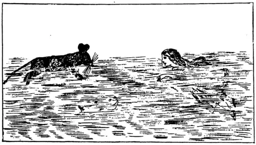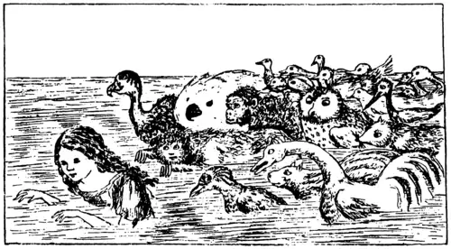 Já era hora de ir, pois a piscina já estava ficando cheia de pássaros e animais que haviam caído nela. Tinha um Pato e um Dodo, uma Arara e uma Águia e várias outras criaturas curiosas. Alice liderou, e todo mundo nadou para a costa.