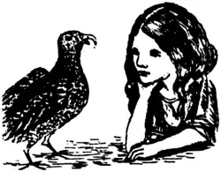 Ela sentou-se por algum tempo triste e silenciosa, mas não demorou até que recuperasse seu espírito e voltasse a falar consigo mesma como sempre: “Gostaria que eles tivessem ficado por mais tempo! Eu já estava fazendo amizade com eles—de fato a Arara e eu já eramos quase como irmãs! Da mesma forma que com a Aguiazinha! E então o Pato e o Dodô! Como o Pato cantou bem para nós enquanto saíamos da água: e se o Dodô não conhecesse o caminho até aquele pequeno chalé, eu não sei como teríamos nos secado—" e não se sabe por quanto tempo mais ela teria falado dessa forma, se não tivesse ouvido o som de passos.