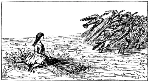 Essa resposta causou um bom impacto no grupo: alguns dos pássaros correram de uma vez; uma velha pega começou a se enrolar com cuidado, falando: “Eu devia estar indo para casa; a noite não é boa para minha garganta.” E um canário chamou seus filhos numa voz tremida: “Meus queridos, saiam de perto dela. Ela não é boa companhia!” Sob vários pretextos, todos foram embora e Alice logo ficou sozinha.