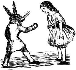 “Mary Ann! Mary Ann!” disse a voz. “Dê-me as luvas nesse momento!” Então veio um som de batidas de pés nas escadas: Alice sabia que era o coelho vindo procurar ela e ela tremeu de forma que sacudiu a casa, até esquecendo que agora ela estava umas mil vezes maior do que o coelho e não tinha motivo para temê-lo. O coelho chegou na porta e tentou abri-la, mas já que abria para dentro e o ombro da Alice estava contra ele, a tentativa foi um fracasso. Alice ouviu-o dizer para si mesmo: “Então vou dar a volta e entrar pela janela.”