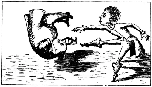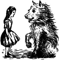 Um filhote enorme estava olhando para ela com grandes olhos redondos e esticando uma pata tentando alcançá-la: “Pobrezinho!”, disse Alice num tom persuasivo. Ela tentou assobiar para ele, mas ela estava terrivelmente alarmada e enquanto ela pensou que ele poderia estar com fome, o que o faria devorá-la apesar de tentar convencê-lo do contrário. Mal sabendo o que ela fez, pegou um pedaço de madeira e segurou para o filhote: ele pulou pelo ar com todas as suas patas sem tocar no chão e com um grito de prazer correu pela madeira e fez parecer que se preocupou: então Alice foi para trás de um grande cardo para evitar ser atropelada e, no momento que ela apareceu no outro lado, o filhote fez outro dardo na vara e ficou de ponta cabeça na pressa de pegá-lo. Então Alice, achando que era parecido como brincar com um cavalo de carroça e esperando a todo momento ficar embaixo de suas patas, correu pelo cardo outra vez. Então o filhote começou uma série de curtos encargos contra a vara, correndo um pouco para frente e bastante para trás e latindo com vontade por enquanto até que por fim ele se sentou, ofegante, com sua língua pendurada para fora da boca e seus grandes olhos meio fechados.