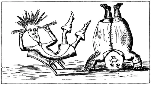 Alice ficou por um minuto olhando, pensativa, para o cogumelo para então pegar um pedaço e cuidadosamente quebrá-lo em dois, segurando o caule em uma mão e o topo na outra. “O que o caule faz?”, ela disse e deu uma mordiscada para tentar; no próximo momento ela sentiu um golpe violento em seu queixo: havia batido em seu pé!