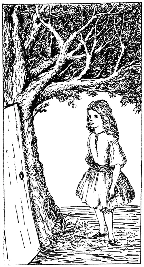 Bem quando ela disse isso, percebeu que uma das árvores tinha uma porta. “Isso é muito curioso!” Ela pensou. “Mas hora tudo é curioso: talvez eu até passe por ela”. E ela foi.