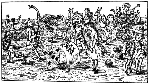 Primeiro vieram dez soldados carregando naipes; eles tinham o formato dos três jardineiros, planos e oblongos, com suas mãos e pés nos cantos. Os próximos eram os dez cortesãos; estavam todos ornamentados com diamantes e andavam em pares, como soldados. Depois desses vieram as crianças Reais: haviam dez delas e os pequenos estão pulando felizes pelo caminho, de mãos dadas, em casais, estavam todos ornamentados com corações. Depois vieram os convidados, maioria reis e rainhas, entre os quais a Alice reconheceu o Coelho Branco: ele falava de forma apressada e nervosa, sorrindo com tudo que falavam e passou sem notá-la. Então se seguiram o Valete de Copas carregando a coroa do Rei numa almofada e por fim, depois de tudo isso, vieram O REI E A RAINHA DE COPAS.