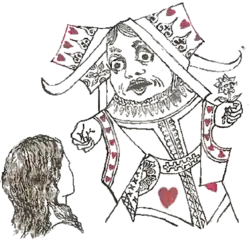 “Como quiser sua Majestade, meu nome é Alice.” Ela disse com coragem, pois pensou consigo mesma: “Porque? Eles são apenas cartas! Não preciso ter medo deles!”