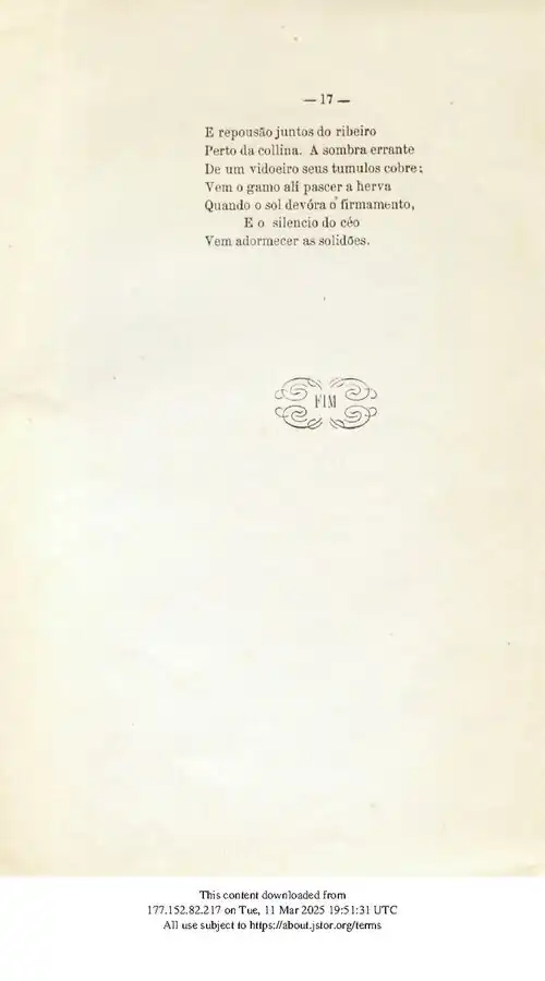 Portanto relere V. Ex. que, ao verter da prosa franceza para verso portuguez, um dos muitos bardos que abundāo nos poemas gaélicos de Ossian, eu nāo o tenha adornado de imagens bellas como sóem fazer aquelles a quem a chamma da intelligencia anima.