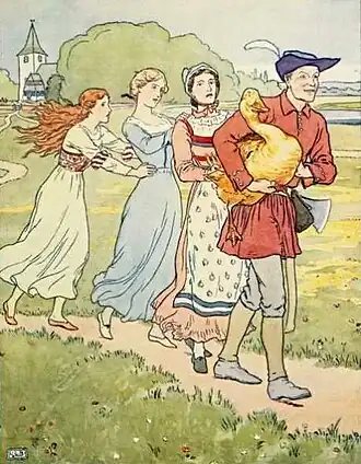 — Se elas estão lá, pensou ela, eu também posso ir lá. Então ela foi até elas, mas no momento que ela tocou as suas irmãs ela ficou grudada, e presa ao ganso, como elas tinham ficado. E então elas fizeram companhia para o ganso a noite toda no relento.