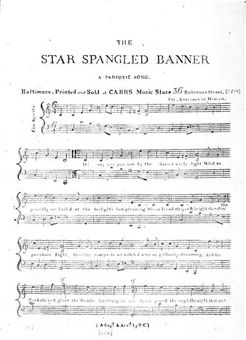 O HINO “The Star Spangled Banner” (a “Bandeira Estrelada”) foi reconhecido como Hino Nacional dos Estados Unidos em 1931. A letra foi escrita em 14 de setembro de 1814 por um jóvem advogado, Francis Scott Key, durante a campanha conhecida como a Guerra de 1812. Vindo da vizinha cidade de Washington, para tratar da libertação de um amigo seu, capturado pelos ingleses, achava-se nesse momento a bordo de um navío de troca de prisioneiros. Após uma noite de bombardeio das fortificações do pôrto de Baltimore, ao raiar da madrugada descobriu o jóvem a bandeira americana ainda arvorada. E, impressionado pelo espetáculo, compôs as palavras do hino, que passaram a ser cantadas com a música de uma canção inglesa muito popular nessa época, “To Anacreon in Heaven.”
