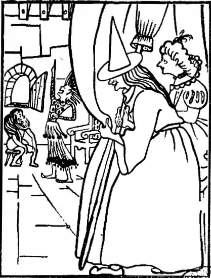 Então a bruxa montou a cavalo na vassoura e disse à dama que montasse atrás dela e, saindo ambas pela janela, ai foram a tôda a pressa pelos ares fora, cortando o vento que nem uma seta.