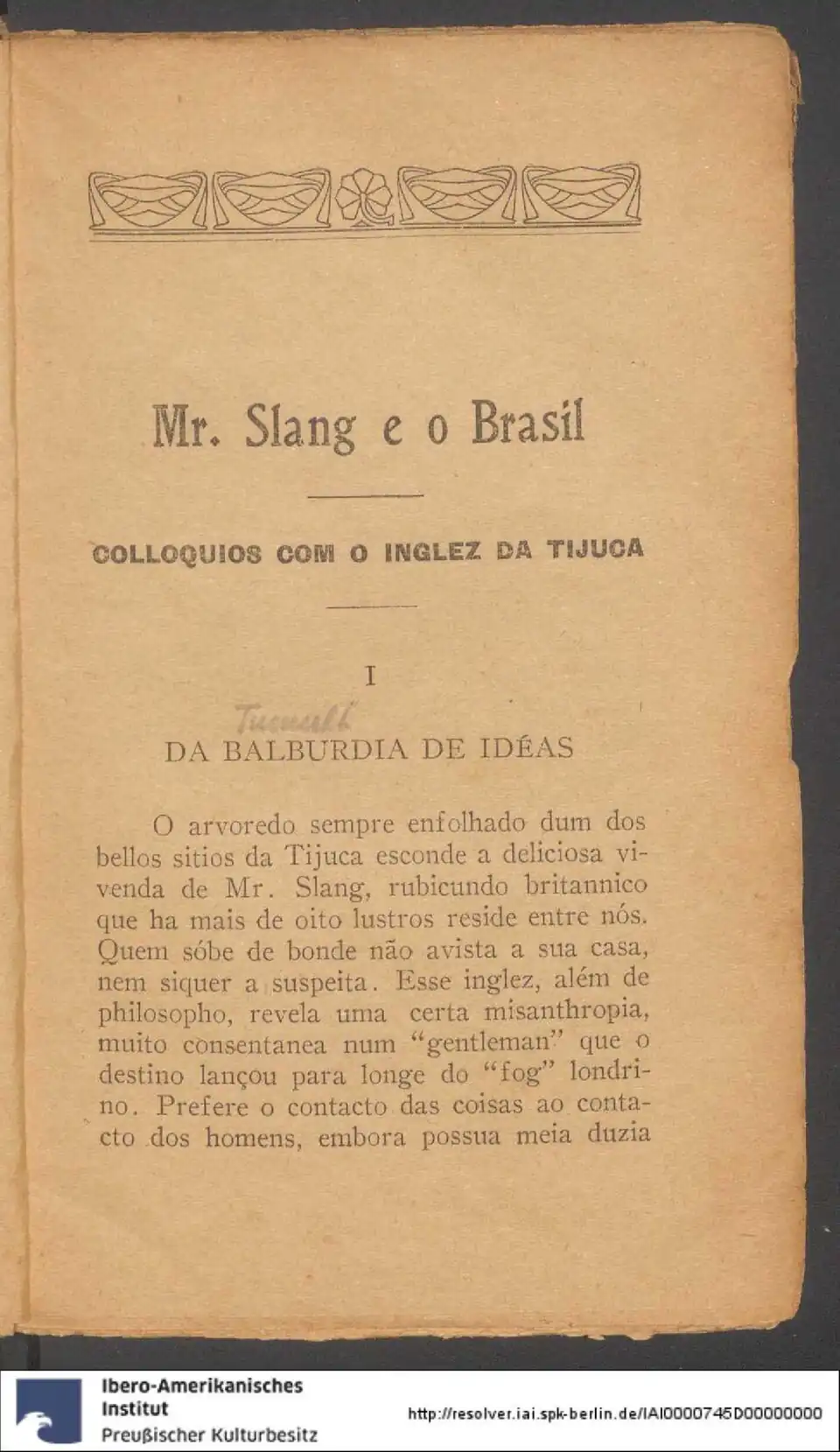 O arvoredo sempre enfolhado dum dos bellos sitios da Tijuca esconde a deliciosa vivenda de Mr. Slang, rubicundo britannico que ha mais de oito lustros reside entre nós. Quem sóbe de bonde não avista a sua casa, nem siquer a suspeita. Esse inglez, além de philosopho, revela uma certa misanthropia, muito consentanea num "gentleman" que o destino lançou para longe do "fog" londrino. Prefere o contacto das coisas ao contacto dos homens, embora possua meia duzia de amigos, com os quaes conversa entre goles de whisky e interminaveis partidas de xadrez.