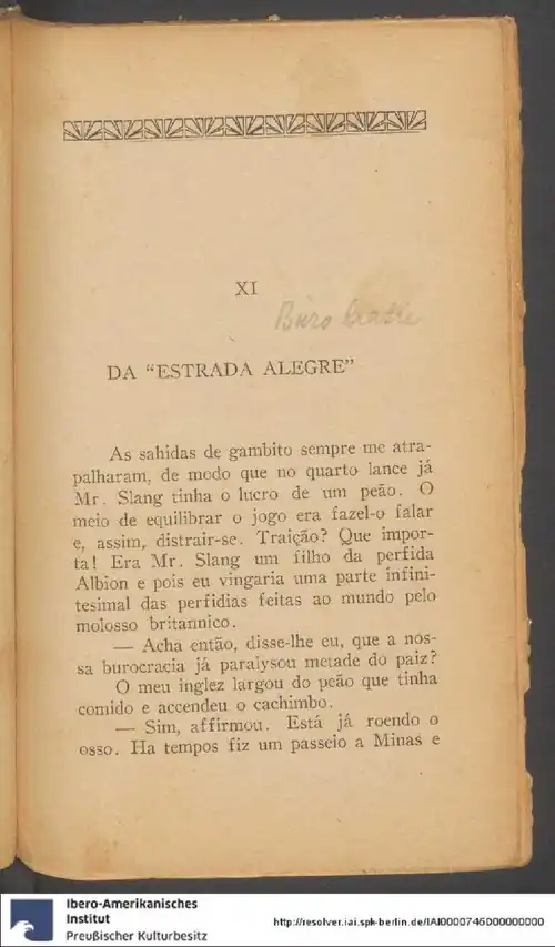 As sahidas de gambito sempre me atrapalharam, de modo que no quarto lance já Mr. Slang tinha o lucro de um peão. O meio de equilibrar o jogo era fazel-o falar e, assim, distrair-se. Traição? Que importa! Era Mr. Slang um filho da perfida Albion e pois eu vingaria uma parte infinitesimal das perfidias feitas ao mundo pelo molosso britannico.