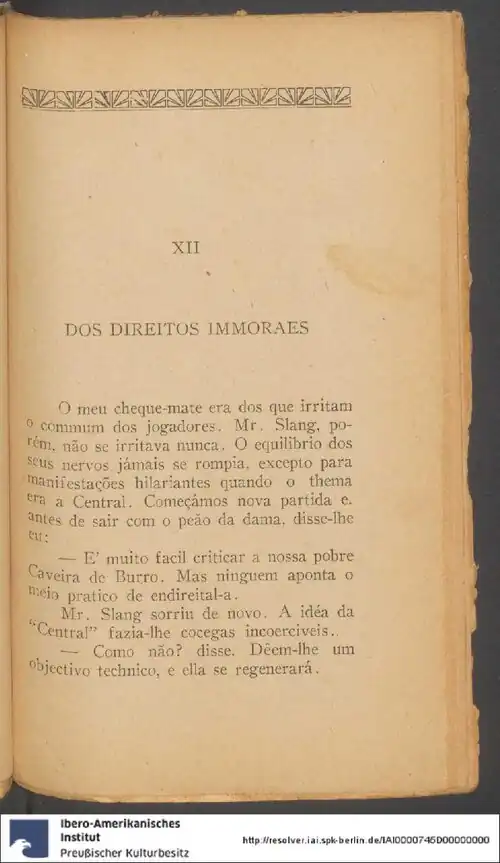 O meu cheque-mate era dos que irritam 0 commum dos jogadores. Mr. Slang, porém, não se irritava nunca. O equilibrio dos seus nervos jámais se rompia, excepto para manifestações hilariantes quando o thema era a Central. Começámos nova partida e. antes de sair com o peão da dama, disse-lhe eu: