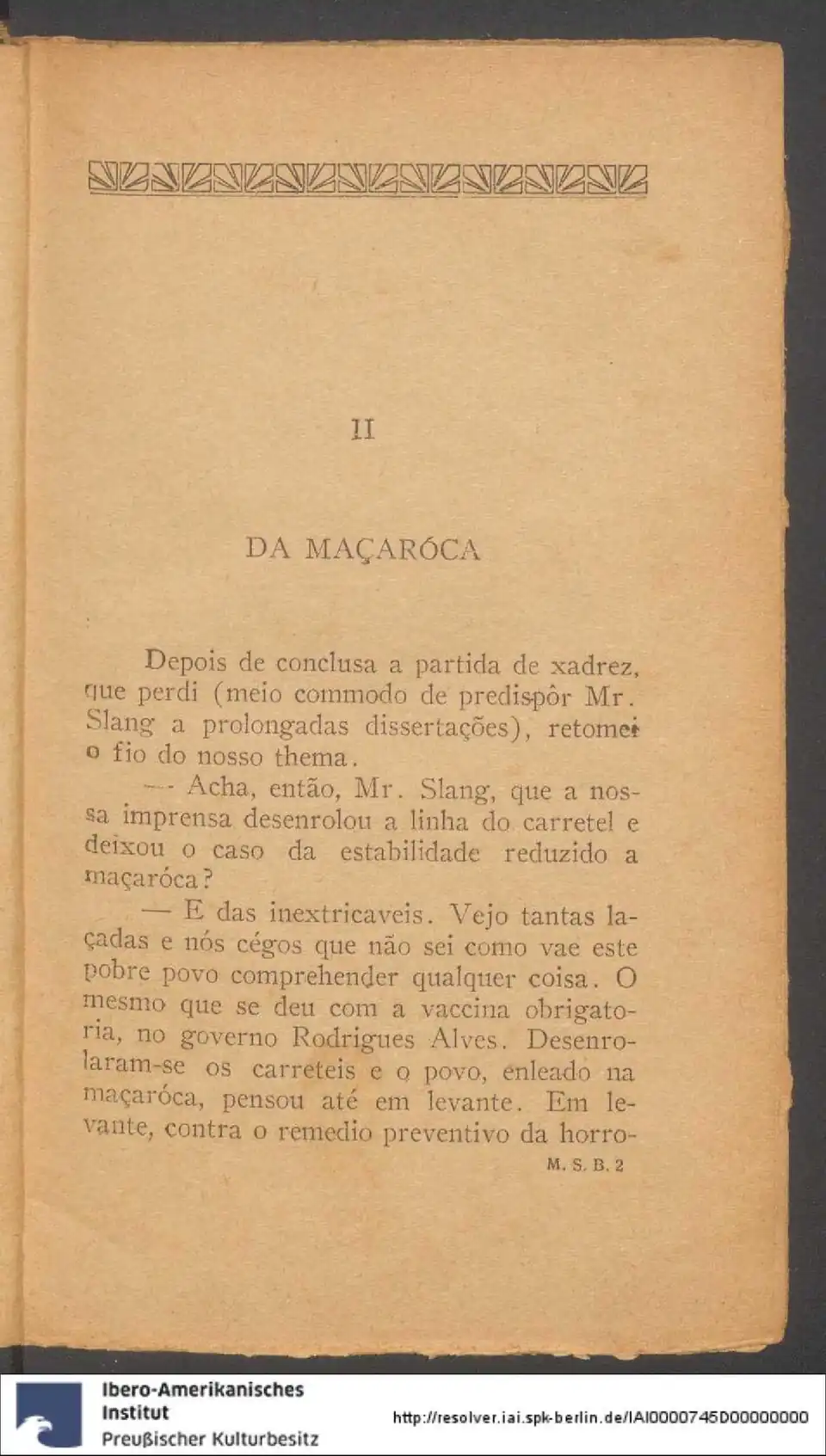 Depois de conclusa a partida de xadrez, que perdi (meio commodo de predispôr Mr. Slang a prolongadas dissertações), retomei o fio do nosso thema.