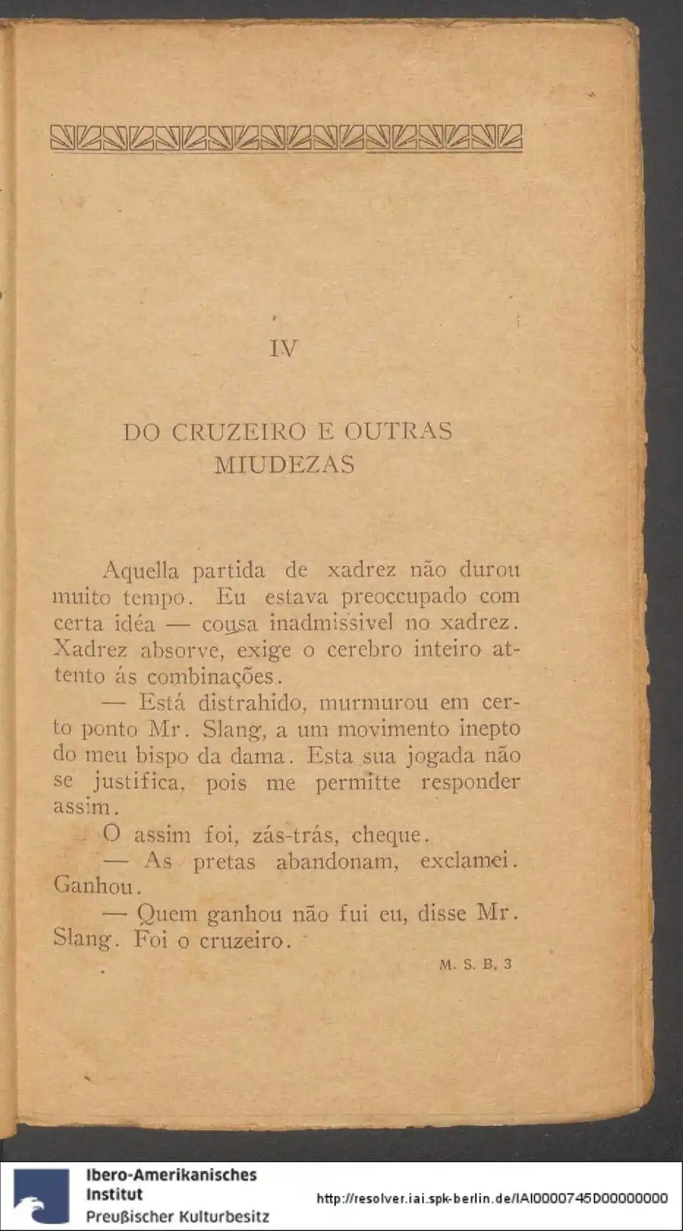 — Está distrahido, murmurou em certo ponto Mr. Slang, a um movimento inepto do meu bispo da dama. Esta sua jogada não se justifica, pois me permitte responder assim.