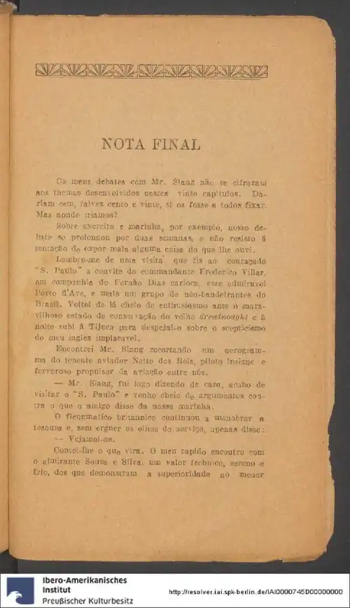 Lembro-me de uma visita que fiz ao couraçado "S. Paulo" a convite do commandante Frederico Villar, em companhia do Fernão Dias carioca, esse admiravel Porto d'Ave, e mais um grupo de néo-bandeirantes do Brasil. Voltei de lá cheio de enthusiasmo ante o maravilhoso estado de conservação do velho dreadnought e á noite subi á Tijuca para despejal-o sobre o scepticismo do meu inglez implacavel.