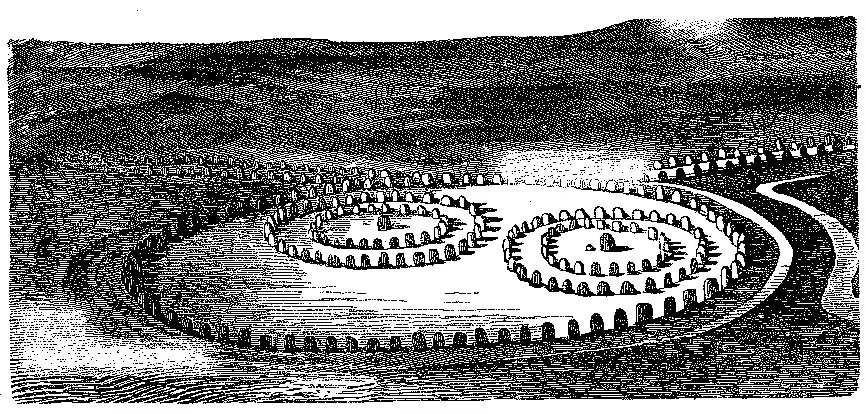 Um largo fôsso de 30 pés, collocado entre duas trincheiras, formava o quinto recinto circular á roda das pedras do circulo exterior.