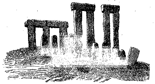 O monumento de Stone-Henge[4] está situado a 6 milhas de Salisbury, em uma eminencia, na proximidade da qual se encontram muitos tumulos; é composto de 4 circulos concentricos, dos quaes os dois maiores são circulares, em quanto os outros dois mostram a forma um tanto elliptica.