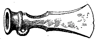 Os machados de bronze, que tem sido encontrados em grandissimo numero em toda a parte e que se vêem em quasi todas as collecções,[9] apresentam entre si differenças notaveis; os typos que damos são os mais conhecidos. Estes machados teem um olhal nos lados, e existem de diversos tamanhos; as faces lateraes são de feitio de uma folha lanceolada sobre o comprido, na qual se vê o vestigio da juncção das duas peças do molde em que o instrumento foi vasado.