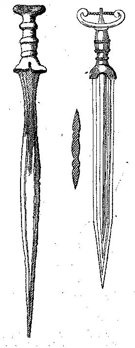 Espadas de bronze.—As espadas de bronze compõem-se de lamina e cabo (punho). São de folhas direitas, chatas, mas reforçadas no centro da lamina, e ás vezes ainda com bojo no espaço comprehendido nos dois terços da folha. Cortam dos dois lados e tem ponta aguda.