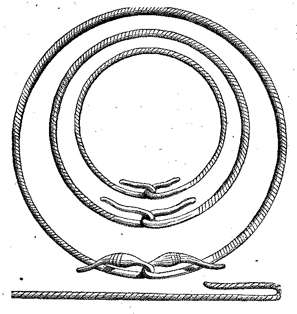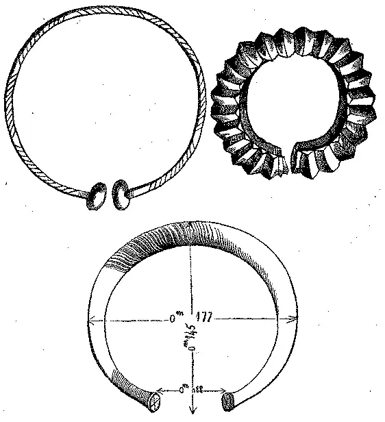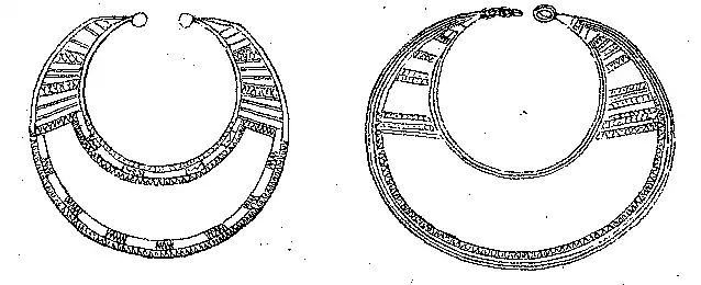 Alguns instrumentos achados por varias vezes nos sepulchros, ou junto dos dolmens, em França e mais frequentemente na Irlanda, consistiam em hastea de ouro arqueada tendo nas duas extremidades um disco, em alguns chato, em outros levemente concavo.