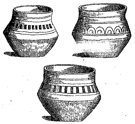Esses vasos não parece terem sido feitos com auxilio do torno, e não apresentam nenhum moldado ou borda; foram unicamente alisados na parte exterior com um objecto qualquer, que lhes deu lustro irregularmente, de maneira que mostram na superficie altos e baixos, mais ou menos lisos, conforme vai indicado na gravura junta.