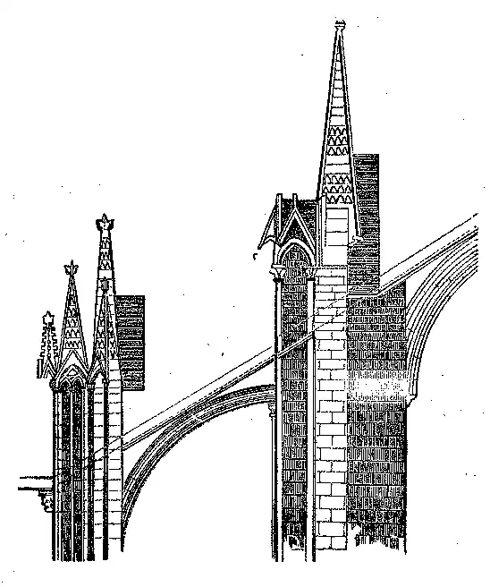 Os contrafortes apparecem com maior sacada. Um rasgo ousado do novo estylo foi collocar arcos-bolantes, fig. 166 (A), sobre os contrafortes. Estes coroavam-se de agulhas (C), e como os arcos iam neutralisar a esforço das abobadas no cimo das paredes; tambem se serviam d'elles para aqueductos dando o escoante ás aguas das chuvas, provenientes do telhado principal da igreja. As aguas eram encaminhadas por um canal cavado no extradoz do arco-bolante, depois lançadas fóra por canos salientes (B), que se chamam gargulhas.