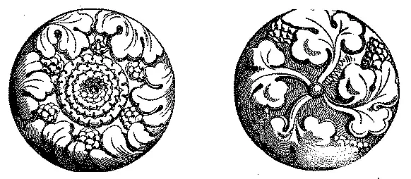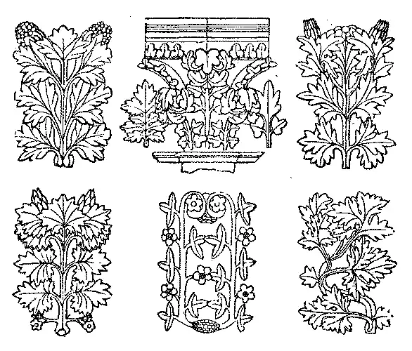 Já se não faziam folhas de fórma carnuda, adornadas de perolas e galões, nem ornamentos com feitios geometricos; como eram os arcos dentados nas ameias, os zig-zags, os rhombos. Principiaram então a imitar, no seculo XIII, os vegetaes indigenas, como mostram os seguintes especimens.