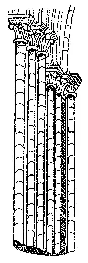 As columnas mui delgadas e enfeixadas formam um dos caracteres mais distinctos da architectura do seculo XIII. Esses fustes, esculpidos inteiriços na mesma pedra, apresentavam, não obstante, muitas vezes, faixas ou engrossamentos que os dividiam por partes eguaes. Em muitas igrejas, a primeira ordem era composta de grossas columnas cylindricas. As columnas enfeixadas occupavam os corpos superiores.